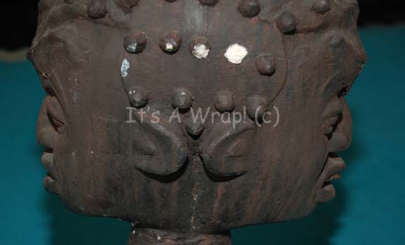 Description: Klingon themed sculpture of two faces staring out and away from one another believed to have appeared variously in Star Trek episodic television. The item is presented on a metal base.