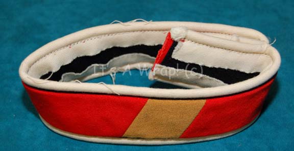 Description: A Starfleet costume accessory like those appearing in Star Trek IV: The Voyage Home and Star Trek VI: The Undiscovered Country. The item is a division strip for an engineer’s white radiological suit made from black felt backing with white borders and a red and gold fabric strip. The red fabric indicates the wearer to be a trainee while the gold flash indicates the intention to become a member of the engineering division. The item is sewn fastened and measures approx. 2 X 5.5 inches diameter.