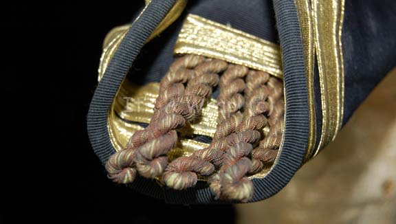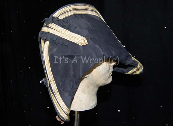 Description: A stunt costume hat created for “Worf” in Star Trek VII: Generations. The item is a Victorian era styled British Royal Navy officer’s hat used during the promotion ceremony that took place in the holodeck. The hat is navy blue with gold trim and braided tassels. The item is fitted for a large Klingon –sized head.