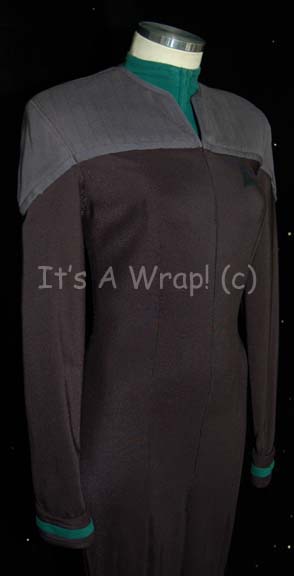 Description: A Starfleet uniform in the style that made its first appearance in Star Trek VIII: First Contact and was made for wear by Gates McFadden as “Dr. Beverly Crusher”. This costume is comprised of a full-length black jumpsuit with gray quilted shoulders, black elastic stirrups at the feet, a form fitting elastic waistband sewn inside with attached loops for ‘away team’ gear, a Velcro patch on the left breast for a commbadge (sold separately), and a Sciences Blue division stripe at the cuff. The uniform zips up the front and comes complete with a Sciences blue dickie sewn onto a flesh-colored undergarment and black, leather, heeled, ankle boots. Uniforms like this were also seen in Star Trek: Deep Space Nine after the episode “Rapture”, and in late seasons of Star Trek: Voyager. The sewn in tags in both garments of this uniform denote it was seen in either Star Trek IX: Insurrection and/or Nemesis, read ‘Gates McFadden’ and ‘Gates McFadden, Dr. Crusher’ respectively, and is one of only a very few thus located.