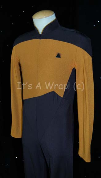 Description: A costume featured in various episodes of Star Trek: The Next Generation and reused in the seventh feature film “Generations”. This costume is a Starfleet uniform jumpsuit and features black shoulders with an Operations Gold chest, back, sleeves, and as piping around the Mandarin collar; black waist and legs that end in stirrups, a zip down the front, Velcro placement for a commbadge on the left breast (sold separately). A sewn in Star Trek VII tag reads ‘Robert Pavell’ and the tag beneath reads ’41, 077’.
