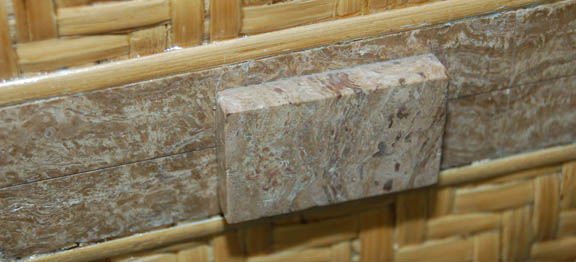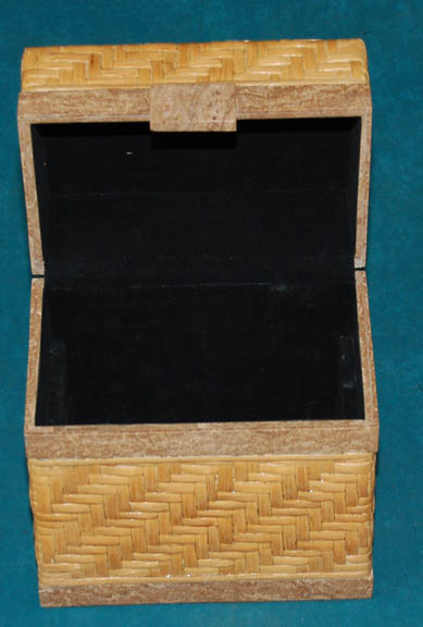 Description: A prop item like those featured in Star Trek: Enterprise episodes like “Civilization” or “Rajiin”. This item is a light tan, woven reed box, shellacked or treated to make it rigid, metal hinges on the back, accents around the lid and bottom made to look like marble or sandstone, and black, felt lining. The item measures approx. 6 X 9 X 9 inches.