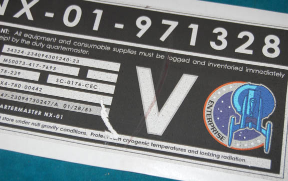 Description: A screen used Starfleet inventory application like those appearing variously in episodes of Star Trek: Enterprise. The item is an inventory label themed in a black color scheme with a graphic of the famous “Enterprise NX-01” assignment patch, a large letter ‘V’ used to denote the type of material associated to the label, and depicts realistic warnings and instructions. The application is in fair condition and depicts a degree of distracting damage in the form of a scrape and a smudge across the face. The item is also distressed to detract from light glare on camera in that it is intentionally painted lightly with spotty distress. It is affixed to a sheet of white coated paper for ease of removal and was carefully removed from a set piece prior to strike. The item measures approx. 10 X 4.75 inches.