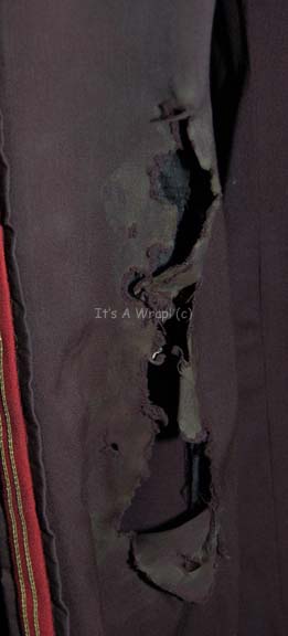 Description: A costume element featured in various Star Trek feature films and then altered for reuse in further feature films. These black, Starfleet uniform trousers were worn by Nichelle Nichols as “Uhura” and feature a wide red, stripe down the leg and were altered for further use by adding twin gold, strips along the middle of the red which denote flag rank; the trousers were also intentionally distressed with a large slash down the right leg. A sewn in Western Costume tag reads ‘Nichelle Nichols’.