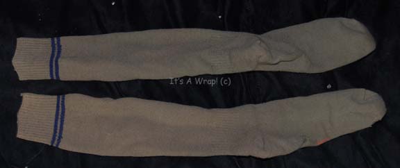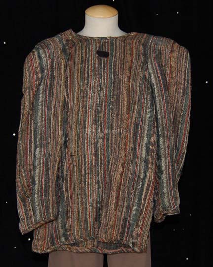 Description: A costume like those featured in the Star Trek: The Next Generation story arc “Unification”. This costume is that of a Romulan civilian and consists of a long-sleeved, woven tunic with multi-colored stripes and black sewn on accents on top, gray trousers, and matching socks. The tunic has been intentionally distressed in that the hem under the arms has been left open. A sewn in Star Trek: TNG tag reads merely ‘Mr. Hunter’.