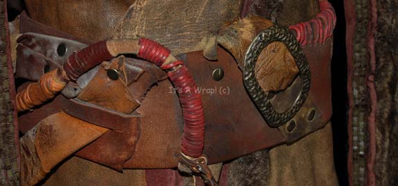 Description: A costume featured in the Star Trek: Enterprise episode “Judgment” and believed to have been later reused in various episodes. This costume consists of a long-sleeved jacket featuring different textures of leather and vinyl, faux fur down the front and back and along the sleeves with further braided leather accents; all in shades of dark brown and black, stitched together in a piecemeal fashion and distressed to appear “dirty” or “used”. Included is bandolier/belt in similar materials and colors with coiled and studded further leather accents stitched together with still more leather cord, and light-brown, overall-style trousers with multiple sites of pleating down the front and sides of the legs. A sewn in Enterprise tag in the jacket reads ‘Juan Mabson 045’, a tag in the trousers reads ‘Joe Billington 045’ and a label on the belt reads ‘Michael Bailous’.