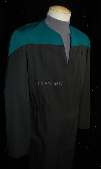 Description: A costume featured in various episodes of Star Trek: Voyager. This costume is for wear by the recognized photo double of Robert Picardo as “The Doctor” and later of John Billingsley as “Dr. Phlox”, J. R. R. Quinonez, it is a black, Starfleet uniform jumpsuit with Sciences Blue division shoulders that zips up the front, clasps at the top, and features a Velcro placement on the left breast for a ‘commbadge’ (sold separately). The waist features form fitting black elastic with sewn in loops for ‘away team’ gear, the feet end in black elastic stirrups. Included is a long-sleeved, gray/blue undershirt with a zip up the back. A sewn in Voyager tag reads ‘J.R.R. Quinonez’ and a second sets the size at ‘44’.