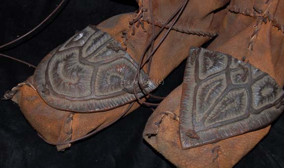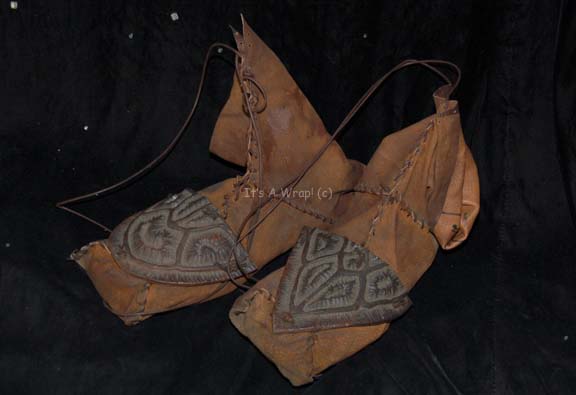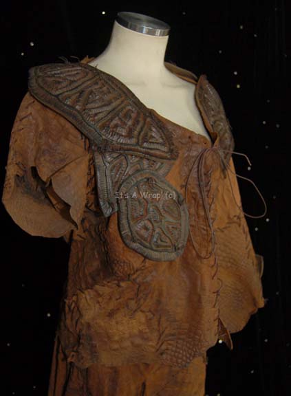 Description: A costume featured in the Star Trek: Enterprise episode “Terra Nova”; wherein the “Enterprise NX-01” discovers the fate of the lost first Earth colony. This costume consists of trousers and a top made of brown roughly cut leather pieces that have been hand stitched together. Attached to the legs, arms and shoulders are pieces of sculpted latex that have been painted brown to resemble the shells of the “diggers” hunted on the planet. The accompanying shoes are made of Neoprene covered in brown hand stitched leather with faux leather latex pieces attached on top. Written directly on the leather of both the trousers and jacket is the name ‘Steven Lambert #1’ and a costumer’s tag reads ’Enterprise 006, Stunt Jamin, Steven Lambert’.