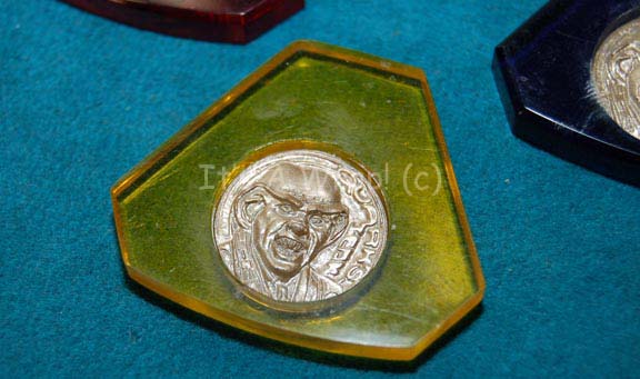 Description: A lot of four gambling tokens used to play ‘Dabo’ at “Quark's” (Armin Shimerman) bar in various episodes of Star Trek: Deep Space Nine. Made of red, green, yellow, and blue acrylic, each chip comes with a metallic silver inset etched with Quark’s smiling face, inscribed in English ‘Quark’s’ with etched Ferengi lettering. Each measures approx. 1.5 X 1.75 inches.