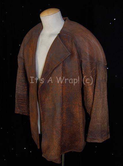 Description: A costume element featured in the Star Trek: Enterprise episode “The Catwalk”; wherein deadly neutronic storms force the crew of the “Enterprise NX-01” to retreat to the nacelle maintenance shafts and some aliens called the Takret board the ship. This item is the jacket worn by “Rellus Tagrim” (Scott Burkholder), a Takret fleeing from his corrupt military; it is a long-sleeved, soft, brown leather jacket featuring reinforced shoulders and a faux reptile-skin design. The item is lightly distressed to appear ‘worn’ and has a sewn in Enterprise tag that reads ‘Scott Burkholder, #038’.