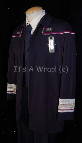 Description: A costume featured in various episodes of Star Trek: Enterprise for wear by Vaughn Armstrong as “Admiral Maxwell Forrest” and later by Steve D’Errico as an admiral in the episodes “Demons” and “Terra Prime” after the ‘death’ of “Admiral Forrest. This costume is an Earth Starfleet Admiral’s uniform consisting of navy-blue trousers, a matching long-sleeved, jacket featuring silver and red piping around the shoulders, further silver and red cuff accents on the left sleeve, and two metal pips below each shoulder denoting the rank of Admiral; a Velcro patch on the left breast for attaching a Universal Translator (included but not attached), a white, long-sleeved, button down dress shirt and matching DKNY tie with an iridescent-blue geometric pattern on it. A sewn in tag in the jacket reads ‘Vaughn, 42’, a sewn in Enterprise tag in the trousers reads ‘Steve D’Errico’ and the name ‘Vaughn Armstrong’ is written on the ‘atlantique’ brand name tag of the shirt; a costumer’s tag reads ‘Enterprise, Admiral Forrest, Vaughn Armstrong’.