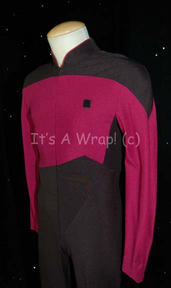 Description: A costume featured in various episodes of Star Trek: The Next Generation. This costume is a Starfleet uniform jumpsuit featuring black shoulders, a Command Red chest, back, sleeves, and piping around the Mandarin collar; a black waist and legs that end in stirrups. This particular uniform has a zip down the back and features a Velcro patch on the left breast for a commbadge (sold separately). A sewn in tag reads ’38, 120’.