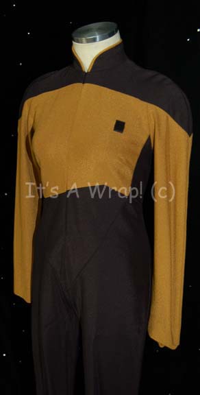 Description: A costume featured in various episodes of Star Trek: The Next Generation. This costume is a Starfleet uniform jumpsuit and features black shoulders with an Operations Gold chest, back, sleeves, and as piping around the Mandarin collar; black waist and legs that end in stirrups, a zip down the front, Velcro placement for a commbadge on the left breast (sold separately). A sewn in tag reads ’Grace Harrell, 222’.