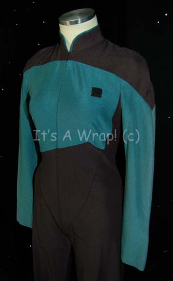 Description: A costume featured in various episodes of Star Trek: The Next Generation. This costume is a TNG-style Starfleet uniform jumpsuit featuring black shoulders, a Sciences Blue chest, back, sleeves, and piping around the Mandarin collar; a black waist and legs that end in stirrups. This particular uniform has zips that close the front of the costume and features a Velcro patch on the left breast for a commbadge (sold separately). A sewn in Star Trek: TNG tag reads ‘Alex Datcher’ and a second tag beneath reads ’32, 49’.