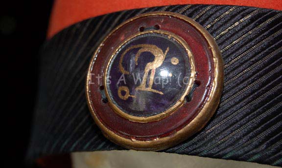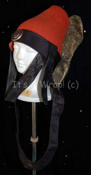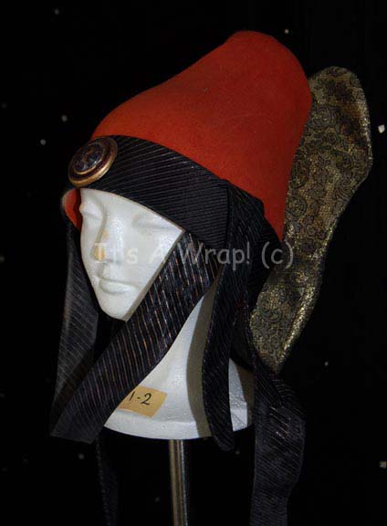 Description: A costume element similar to those featured in various Star Trek feature films. This item is a rust-colored felt, Vulcan-style hat featuring soft, black and gold pin-striped trim, chinstrap, and drape that sits upon the chest; a large metallic-gold colored accent in the back has a black floral pattern and there is a dark-blue, faux jewel with Vulcan iconographic symbol inscribed on it. A sewn in Paramount tag reads ‘1-2’.