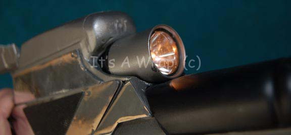 Description: A prop Starfleet Type III Mark III phaser rifle made specifically for Star Trek X: Nemesis. The item is a solid cast resin prop energy weapon painted metallic gunmetal with metallic chrome colored adhesive applications, a black painted muzzle, textured grips and butt stock, a broken ‘sighting scope’, a cavity for a flashlight, and a black nylon shoulder strap fixed in a static position. The accompanying flashlight is a ‘Surefire’ name brand light with a twist activation and a thumb button activation on the end. The light is powered by two Surefire name brand SF123A sized 3volt batteries held internally which retain power from production use and are very bright! The item measures approx. 10.25 X 33 X 2 inches and depicts only the slightest of scuffs on the barrel end and a few chips in the paint on the butt stock edges.