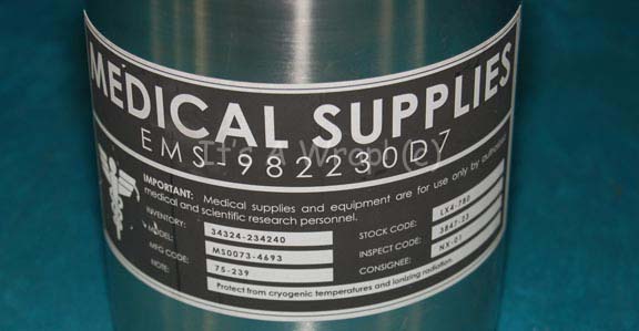 Description: A set dressing item appearing variously in episodes of Star Trek: Enterprise on the set of the “Enterprise NX-01” sickbay. The item is a fashioned metal container with a clear plastic window in one side and a matching metal lid. The lid and the container both feature Starfleet inventory applications, the one on the side reads ‘Medical Supplies’ and recommends protecting the contents from ‘cryogenic temperatures and ionizing radiation’. The item measures approx. 6.75 X 5 inches diameter.