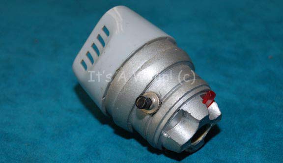Description: A hand prop sensor created for Star Trek feature films and episodic television. The item is fashioned from injection molded plastic and molded resin painted metallic silver. The item features two black buttons opposite one another on the sides that are believed to activate the red bulbs mounted externally. The item does not retain any power from production use and has not been opened to determine its battery needs. The item measures approx. 2.75 X 2 X 2 inches.