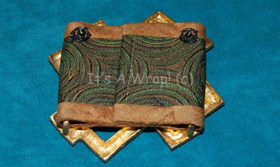 Description: A costume broach like those worn almost exclusively by “Quark” (Armin Shimerman) in episodes of Star Trek: Deep Space Nine. The item is a fashioned gold colored metal buckle with a green and gold colored fabric interior that features snap backing for a corresponding costume. The item measures approx. 3.75 X 3.5 X 0.5 inches.