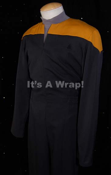 Description: A costume featured in various episodes of Star Trek: Voyager and for wear by David Anderson as the recurring character of ‘Ensign Ashmore”. This costume is a black Starfleet uniform jumpsuit with Operations Gold division shoulders that zips up the front, clasps half way up the chest, and features a Velcro patch on the left breast for a Starfleet ‘commbadge’ (sold separately). The waist features form fitting black elastic with sewn in loops for ‘away team’ gear, the feet end in black elastic stirrups. Included is a long-sleeved, blue/gray uniform undershirt with a zip down the back. A sewn in Voyager tag in both items reads ‘David Anderson’, another tag in the uniform sets its size at 40 and the undershirt at 38.