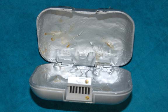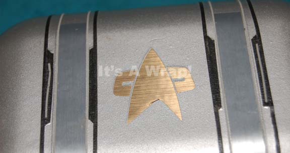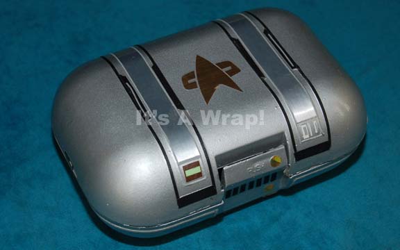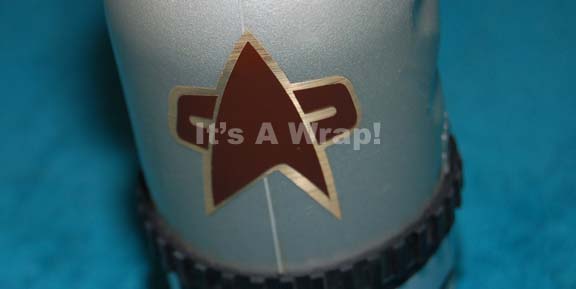 Description: A lot of Starfleet ration packs like those appearing in Star Trek IX: Insurrection. The items are a plastic water bottle and a molded resin flip-top box, both painted metallic silver with adhered Starfleet themed graphical applications applied to them and multiple metallic silver and gold adhesive accents and details. The water bottle features a flip top lid and is believed to be functional, the box features a flip top lid and a catch with an unfinished interior that depicts the resin molding process. The underside of the ration pack features a Starfleet inventory application reading ‘Emergency Use Only 67-517’ with realistic and humorous use instructions. The items measure approx. 7 X 5 X 2.75 inches and 8.5 X 3.5 inches diameter. Items like this appeared in the scene preceding the transporter tag drones arrival in the mountains while they were being dispensed to “Dr. Crusher” (Gates McFadden) and “Councilor Troi” (Marina Sirtis) by “Data” (Brent Spiner).