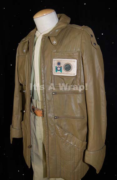 Description: The last known available costume made for wear by Merritt Butrick in his portrayal of “Dr. David Marcus”, this one specifically used in Star Trek III: The Search for Spock. The costume is made from all high quality synthetic material and leather components. The costume is a set of light olive colored trousers with stylized Velcro cuffs at the ankles, front pockets, sewn in belt loops, a clasp and zipper fly, interior buttons for suspenders, and a sewn in Western Costume Co. tag reading ‘Merritt Butrick’. The trousers depict one slight snag on the front right leg above the knee, a variety of minor discolorations due to production use, and are in otherwise excellent condition. The corresponding belt is tan leather with metal accents and a metal buckle, in excellent condition. The costume top is aqua colored spandex with white fabric interior lining, a zip front that features snaps to hide the zipper, stylized sleeve cuffs with Velcro seals, multiple thread lines for a futuristic appearance on the sleeves, shoulder fronts and backs, and an oval and triangle shaped inset on the left front. The oval shaped inset features a molded metal ‘researcher badge’ that is pin backed and was located on the costume, the backings are visible inside the costume, and the item is painted rust red with a bronze tone. The costume top features a sewn in Western Costume Co. tag inscribed ‘(Double)’ which may indicate it was a stand-in, stunt, or additional piece. Excepting a smudge at the waist line, the top is in perfect condition. The costume coat is brown colored vinyl with a green nylon interior lining, with similar stylized sleeve cuffs, a heavy duty zippered front with a ball zip pull specific to Star Trek feature films, snap shoulder epaulettes, snap collar bracings, a metal gear loop attached to the center of the back, and an astonishing eight functional pockets. The pockets consist of two open topped breast pockets, one with a ‘researcher’s badge’ made from multiple elements including a green plastic accent and a translucent green window that depicts internal technology. Four zip topped pockets feature the same ball zipper pull, and two deep and wide open topped pockets are at the waist. The sewn in Western Costume Co. tag in the coat reads ‘Merritt Butrick’. Finally, the costume is accompanied by a pair of brown leather shoes with inside zips labeled internally ‘M. Butrick’. The shoes feature dried mud on the soles from production use on the Genesis Planet set, and some of the coat pockets also feature stone debris from the set as well. A costumer’s tag reading ‘Merritt Buttrick as David Marcus’ accompanies the lot, perhaps one of the finest and best preserved of all Star Trek feature films costume in this collection.