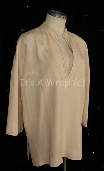 Description: A costume element featured in the first Star Trek feature film. This item is a long-sleeved, off-white linen shirt, featuring maroon-thread accents, a v-shaped neckline, and slight staining on the left sleeve.
