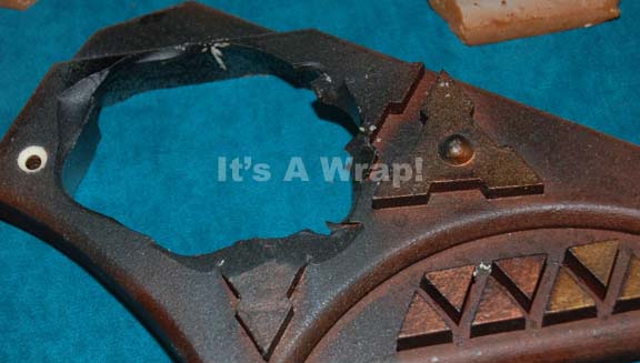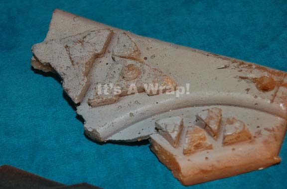 Description: A lot of tow Klingon button panels like those used by “Captain Archer” (Scott Bakula) in the Star Trek: Enterprise episode “Bounty”. The items are a molded resin and shattered molded wax version of the item. The resin item is painted rust brown with metallic copper raised triangular buttons and screw holes for wall mounting. It features a” blown out” section in the middle. The wax version is shattered into five pieces that are only base painted and are believed to have been a test piece for the special effect. The items measure approx. 8.25 X 5.75 X 1 inch.