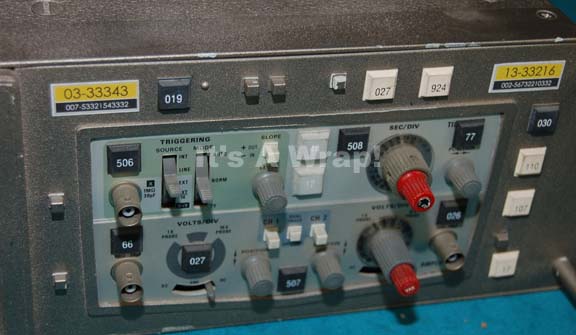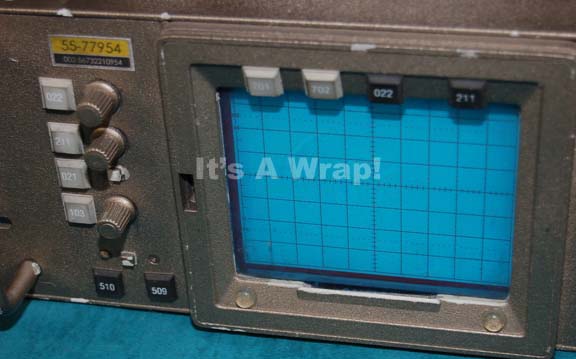 Description: A piece of set dressing like those featured in various episodes of Star Trek: Enterprise. This item is a ‘Tektronix’ name brand oscilloscope that has been altered for screen use. The item is painted metallic gray with multiple additional varying faux rubber buttons placed across its instrument face. The item features several rotating knobs, buttons, switches, and a blue colored readout screen. This untested device also features multiple inputs in the reverse and is suitable for deck mounting. It features a Type-B three prong plug for standard American electricity. The item measures approx. 19 X 18.5 X 5.5 inches.