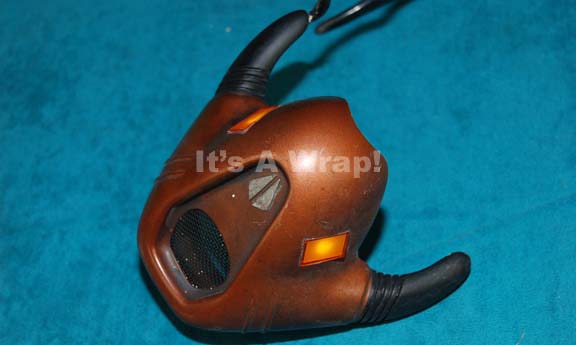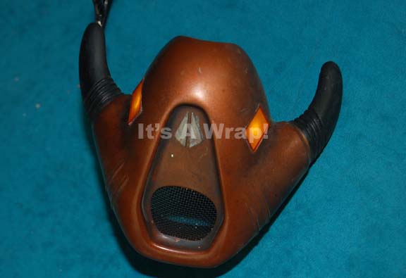 Description: A prop filter mask featured in the Star Trek: Enterprise episode “Acquisition” for use by “Krem” (Jeffrey Combs), “Muk” (Clint Howard), “Grish” (Matt Malloy), or “Ulis” (Ethan Phillips). The item is injection molded plastic painted metallic copper with a black colored screen over the mouth area, one black cheekbone brackets, and two placements of working battery powered lights that activate by way of an internal switch. The battery retains power from production use and is painted to match. The item measures approx. 5.75 X 4.75 X 4 inches and is inscribed internally ‘K’.