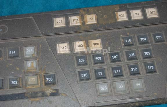Description: A piece of set dressing like those appearing variously in episodes of Star Trek: Enterprise. The item is a ‘keyboard’ button panel in molded resin with multicolored, rubber faux buttons with numerical values adhered across its surface. The item is molded to present several raised features and is adorned with a single blue gel dome ‘electric eye’. Items like this appeared in virtually every set used to create the “Enterprise NX-01”. The item is distressed in the form of staining scuffing meant to denote trauma sustained during battle or other action. The item measures approx. 13 X 5 inches.