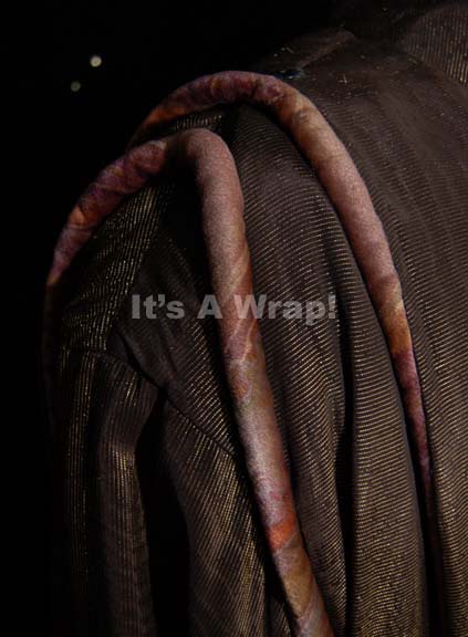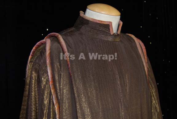 Description: A costume element believed to have been featured in Star Trek: The Motion Picture during the Kolinahr sequence at the beginning of the film. This item is believed to be one of the under robes worn by the Kolinahr Masters during Kolinahr ceremony “Spock” (Leonard Nimoy) was undergoing; it is a full-length, large, flowing, robe in a metallic-brown with pleated sides accentuated by large, rust-colored trim down the front, back, and around the collar; sleeves so large that they flow into the bottom of the robe and do not detach from it, pleated sleeves, and soft, velour lining with stripes in shades of rust, and a zip down the back. Due to time and storage, there is a minor degree of fading and damage to the trim along the shoulders. This item is sturdy and very well made, heavy even; it is believed to correspond to the Vulcan tabards associated to lot numbers 914 or 917 of the Christies, New York, 40 Years of Star Trek: The Collection auction of October 2006 and has button holes for such an item on the shoulders.