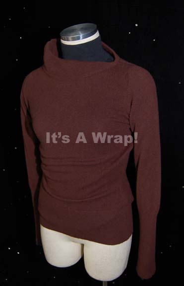 Description: A lot of costume elements like those featured in various episodes of Star Trek: Voyager for wear by Kate Mulgrew as “Captain Kathryn Janeway”. This lot consists of a brown, long-sleeved, irregularly-necked turtleneck sweater, and a black, long-sleeved, blouse with a high collar. A sewn in Voyager tag reads ‘Kate Mulgrew’ and both items were found amongst others of their kind in the “Kate Mulgrew” selection.