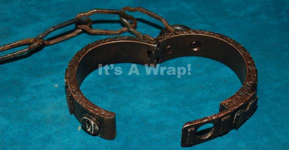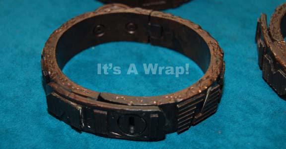 Description: A lot of Ferengi manacles used on “Captain Archer” (Scott Bakula) in the Star Trek: Enterprise episode “Acquisition”. The items are molded resin binder cuffs with elongated metal chains and an extra cuff, all painted metallic bronze. The cuffs open and seal easily by slipping over a faux key hole. The items measure approx. 3.75 X 3.75 X 0.75 inches.