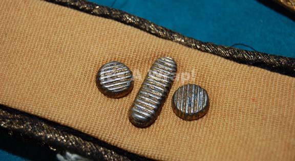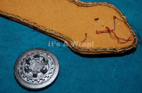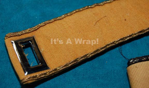 Description: A lot of costume accessories appearing variously in Star Trek feature films and episodic television. The items are Starfleet officer’s operations division strips comprised of yellow fabric with gold trim. The shoulder strip features a reinforcement and remaining threads from the removal of a ‘security disk’, and accompanying molded rubber security disk is present painted metallic silver. The sleeve strip features a wired in gold painted ‘commendation bar’ and two ‘5 year’ service pins.