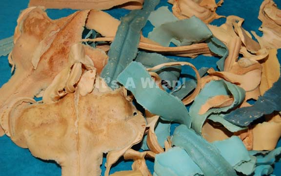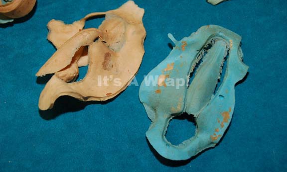 Description: A lot of multiple special effects make-up items like those appearing variously in Star Trek episodic television to create Bolian character aliens. The items are presented in an unpainted, unused condition, molded from blue and flesh tone colored foam rubber making up the bifurcating ridge characteristic of the alien’s faces.
