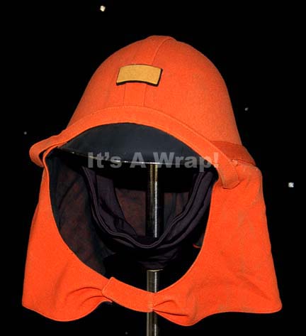 Description: An orange cloth covered metal helmet like those appearing in Star Trek II: The Wrath of Khan for wear by Starfleet environmental engineers. Appearing in the deep background during the funeral services for “Spock” (Leonard Nimoy), the item is a black metal helmet with orange cloth covering and a hood that extends around the face and neck, snaps under the chin and features a black nylon interior. The ridge of the helmet from the front to the back is folded over cloth affixed and features a cropped yellow operations division strip affixed to the forehead. The item is in excellent condition with dust stains from time and storage conditions being the only imperfection.
