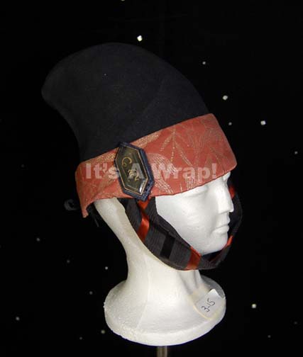 Description: A costume element similar to those featured in various Star Trek feature films. This item is a black felt hat in the Vulcan-style, featuring peach-colored trim, reflective gold-colored floral accents, a black and rust-colored chin strap, and a hexagonal faux jewel on the side with Vulcan iconographic symbol. A sewn in Paramount tag reads ‘3-15’.