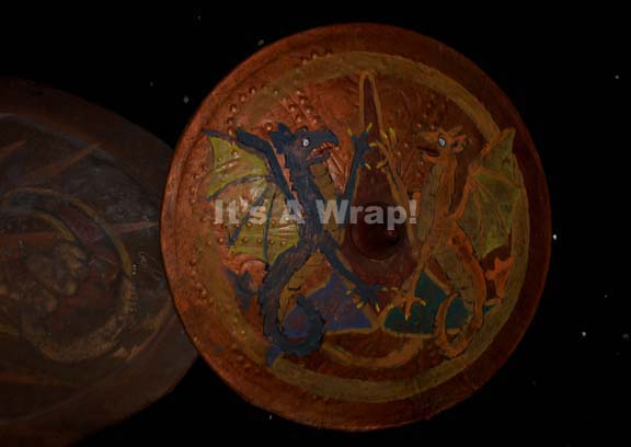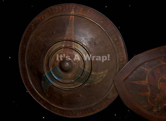 Description: A lot of four shield set dressings featured in various episodes of Star Trek episodic television. This lot consists of four shields; the first one is a round, metal shield featuring round, raised accents around the outside, raised stripes at various spots around the circumference, the Klingon symbol painted in the middle and fragile, vintage leather lining the shield and cracked, brown leather handles. The second shield is distressed, rounded diamond shape with a raised circle in the middle of an "X" and a snake figure painted on it; according to continuity guides, both shields were featured as set dressing in the Star Trek: Enterprise episode "Bounty". The third shield is smaller, is worn brown leather wrapped around a wooden core, features a dragon design painted on it, textured pattern of hearts around the circumference, a pointed knob in the middle, vintage leather lining with one brown leather handle. The last item is a buckler more than a shield of black wood, metal triangles around the outside and metal, star-shaped accents. The reverse features a hand written inscription 'RKO' referring to the vintage production company RKO Radio Pictures. The first shield has an approx. diameter of 25 inches, the second approx. 35 X 17 inches, the third approx. diameter of 18 inches and the last a diameter of approx. 12 inches. All three items feature the tri-color Klingon Empire trefoil emblem painted on the face of them.