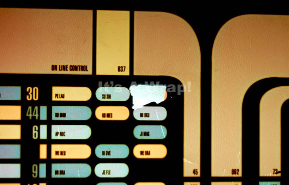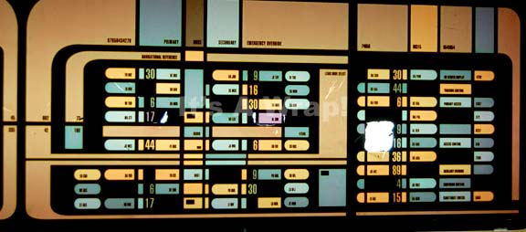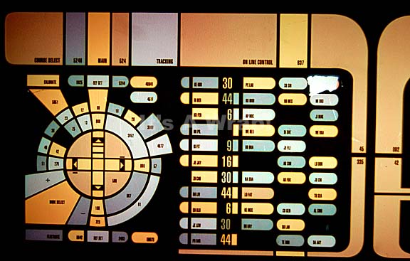 Description: An LCARS style panel (Library Computer Access and Retrieval Systems) like those appearing variously on the set of the “U.S.S. Voyager” in episodes of Star Trek: Voyager. The item is a sheet of smoked acrylic with a multi-colored graphical application adhered to the reverse that is best viewed when back lit by an external light source. The graphic depicts multiple faux buttons, indicator lights, readouts, and displays, an attitude/pitch control on the left side and two places where individual light boxes were removed prior to set strike. The graphic on the reverse is of the variety that is single sheet instead of fashioned from multiple translucent gels. The indicators read ‘Navigational Reference’ and ‘Emergency Override’ and more. The item measures approx. 13 X 45 inches and the corners are rounded. The item depicts a minor amount of scuffing on the face and some smudging due to time and storage conditions but is in otherwise good condition and used.