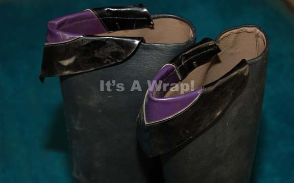 Description: A costume element like those featured in various Star Trek feature films and in episodic television. This item is a pair of heeled, knee-high, black, leather boots with purple and black vinyl accents on the top. The boots are in very good condition and have a tag inside that reads ‘Custom Made by Willie’s of Hollywood’.