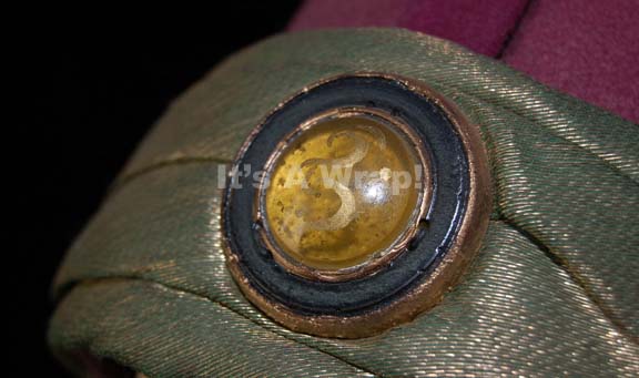 Description: A costume element similar to those featured in various Star Trek feature films. A magenta-colored, Vulcan-style, felt hat featuring metallic-gold trim with a green tinge that also forms a chinstrap; a round, yellow faux jewel in the front with Vulcan iconographic symbol in the middle and dark-blue trim. A sewn in Paramount tag reads ‘6-1’.