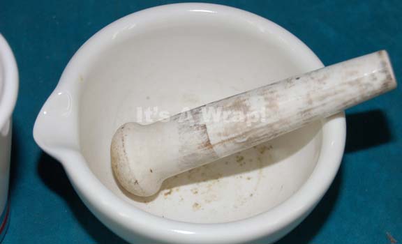 Description: A lot of two ceramic based set dressing items appearing variously in episodes of Star Trek: Enterprise. The items are a white jar with a fitted lid, a metal base, and a mortar and pestle believed to have appeared in the episode “Civilization”. The items measure approx. 5.25 X 3.75 inches diameter and 2.5 X 5.25 inches diameter with a pour lip.
