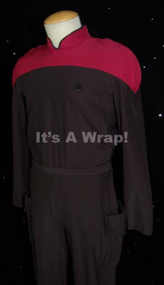 Description: A costume featured in Star Trek: The Next Generation episodes like “The First Duty” and possible use in the later Voyager episode “Flesh and Blood”. This costume is a Starfleet cadet uniform consisting of a long-sleeved, full-length, black jumpsuit featuring red shoulders, black piping around the Mandarin collar, a Velcro patch for a commbadge (sold separately), a matching black belt, deep, open-topped pockets on each trouser leg, a zip down the back, and stirrups for the feet. A sewn in Voyager tag reads ‘Sam Vinny’.