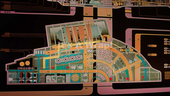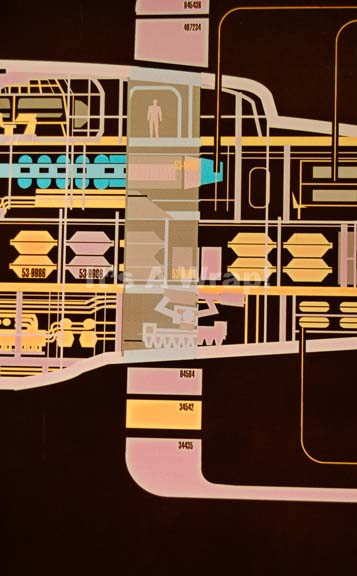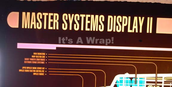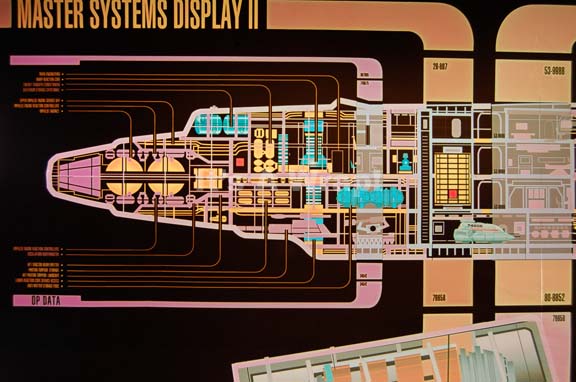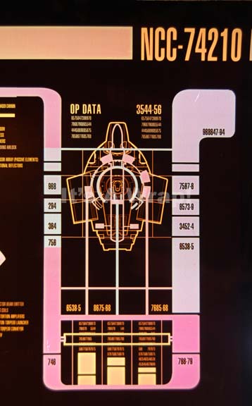 Description: A large LCARS (Library Computer Access and Retrieval) panel graphic used in the engineering set of the “U.S.S. Valiant” on the Star Trek: Deep Space Nine episode “Valiant”. The item is a large translate graphical application depicting interior ship schematics and cross sections of the Defiant-Class starship. It appeared in a scene taking place between “Nog” (Aaron Eisenberg) and “Jake Sisko” (Cirroc Lofton) The graphic is multi-colored and features two small dorsal views of the ship with various highlighted sections, a larger dorsal view of half of the ship that features positions of the sickbay, galley, bridge, engineering, and weapons emplacements, and a cross section from the side of the ship which locates the main shuttlebay with a shuttle in it, the location of main engineering, and the bridge. The display is inscribed ‘Master Systems Display II’ and ‘NCC-74210’. The item is best viewed when back lit by an external light source. The item measures approx. 38.25 X 68.25 inches but will ship rolled.