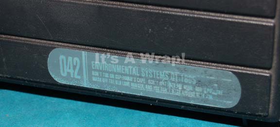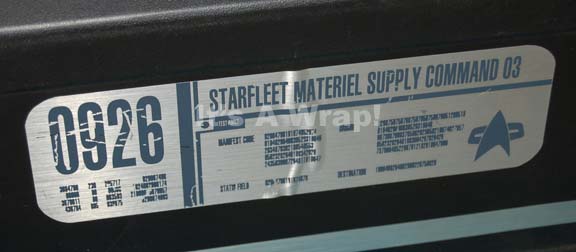 Description: A prop Starfleet carry case like those appearing in various episodes of Star Trek: The Next Generation and Star Trek: Voyager. This item is injection molded plastic with a molded carry handle and two flip larches that when unlocked allow the item to open on hinges. The item features a metallic silver Starfleet inventory application reading ‘Starfleet Material Supply Command 03’, various sites of numerical data, and adorned with a graphic of the Starfleet emblem that came into service following the release of Star Trek VII: Generations. The item also has a second inventory application on the lower right of the opposite side reading ‘ENVIRONMENTAL SYSTEMS 01-1865’ and featuring one of the “in-jokes” present on so many “okudagrams” written too small to be seen onscreen. There is minor scratching on the surface of the inventory applications and the item measures approx. 19 X 11 X 4.75 inches.