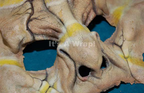 Description: A special effects make-up mask appearing in episodes of Star Trek: Enterprise like "Terra Prime". The item is made to create the character of Rigellian aliens and is composed of supple molded foam rubber painted flesh tone and yellow with blackened cracks to enhance the alien appearance of the character. The edges are dry in some areas but the item is in excellent condition.