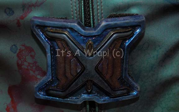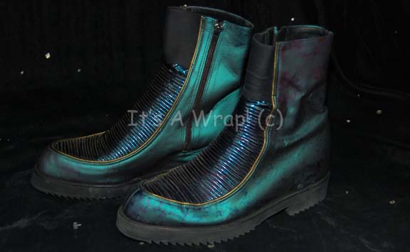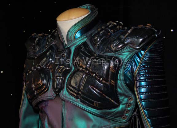 Description: A costume featured in the tenth Star Trek feature film “Nemesis”. This costume is a Reman military uniform and consists of a soft, black, sleeveless under shirt; a long-sleeved, full-length, molded vinyl, iridescent-purple jumpsuit featuring gold-colored piping, reinforced, pleated vinyl pads all along the surface of the suit, zip cuffs and ankles, a zip front, and matching shoes; a molded vinyl, chest/shoulder armor piece with a variety of stitched in metal details and a Velcro seal. Written in the costume is the name ‘Brian Patterson’.