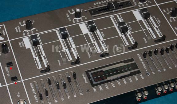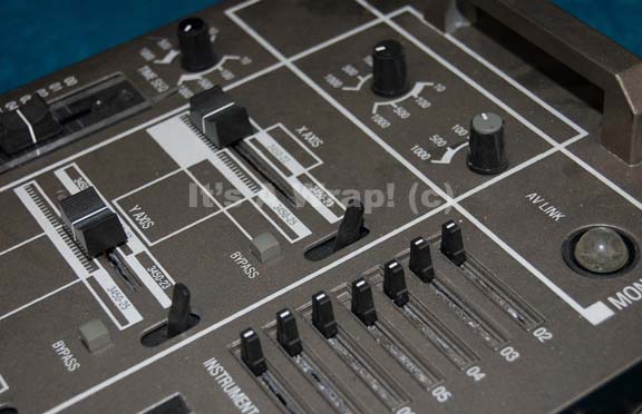 Description: A piece of set dressing featured in various episodes of Star Trek: Enterprise in the engineering department. This item was inset into any one of a large series of like control junctions that made up parts of the walls of engineering. Carefully removed from sets, this item is in reality a ‘Radio Shack Sound Mixer board with a serial number of ‘006163’. The item is powered by a two prong standard 120volt plug that, when activated, does cause onboard lights to come on but has not been tested on actual sound equipment. Consisting of five main slides down the front, various dials, more slides, buttons and switches, this already handsome item was altered in appearance, painted in the color scheme of the “Enterprise NX-01” engineering bay. The RCA-style audio plug ins on the back are a series of four stereo channels, an effect and output jacks, and a monopole microphone jack. With handles on either side, screw holes for wall or rack mounting, and rubber feet on the bottom for table top use, this item is completely versatile and a definite rarity. The item measures approx. 19 X 9.5 X 3.5 inches.