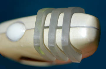 Description: A prop item featured in the Star Trek: Voyager episode “Relativity”; wherein “Seven of Nine” (Jeri Ryan) is recruited, repeatedly, by “Captain Braxton” of the 29th century time ship “Relativity” to go back in time and prevent the destruction of “Voyager”. This item is the scanner that the “Ducane” (Jay Karnes) character waves over “Seven’s” ocular implant to make it disappear so she will not arouse suspicion in her mission; it has an irregularly, vaguely round, off-white, plastic housing featuring three white buttons on the top, a larger, white button on the bottom, and three, thin, clear accents on the front. The first two buttons cause red, orange, green and blue lights to alternate between the thee clear plastic pieces on the front, the big button on the bottom seems to be only for decorative purposes; there is a roughly rectangular “window” on the left side that, when the last button is pressed, lights up a display of different wavelength “scans”. Access to the working electronics is made via three screws on the left side of the item that still features battery power from production use. The item measures approx. 4 X 2 X 1 inches.